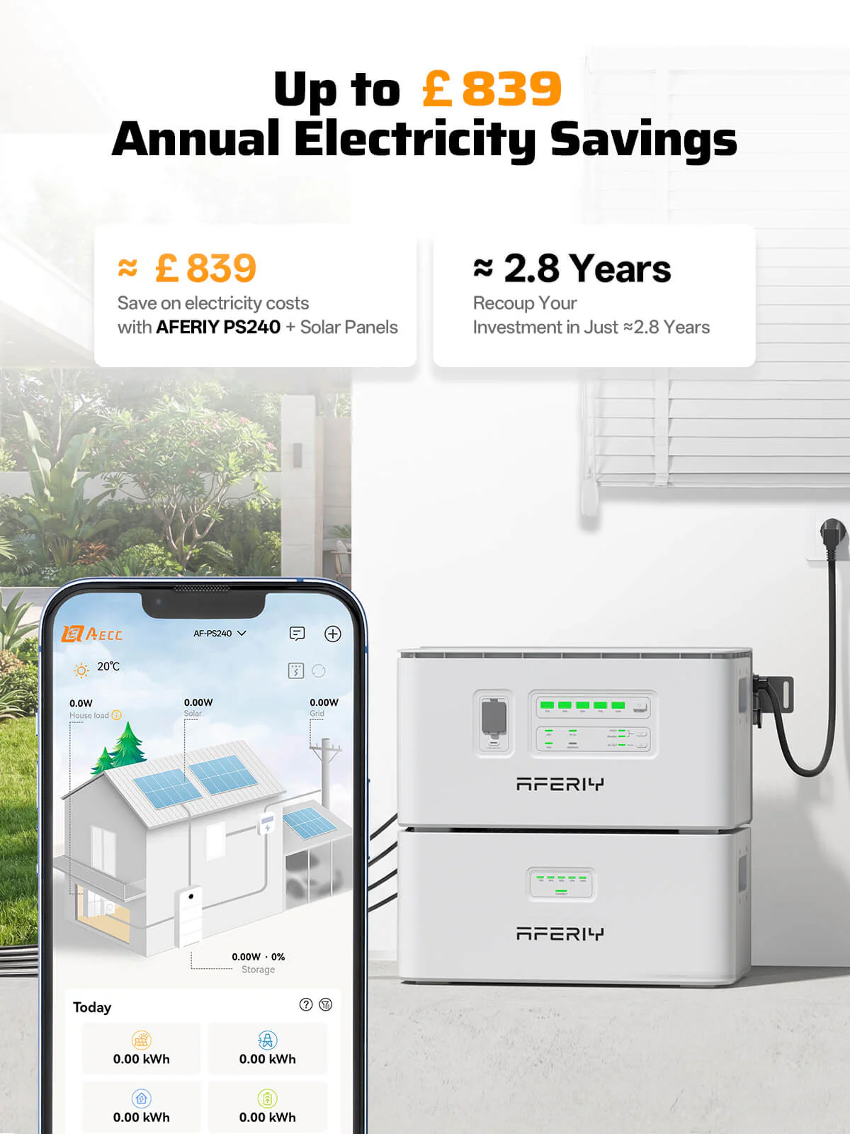 Using the intelligent mobile app, the PS240 can automatically charge when electricity prices are low and discharge when tariffs are higher. Combined with real-time energy monitoring, the system helps optimise energy usage and can reduce annual electricity costs by up to £839 depending on usage and local tariffs.